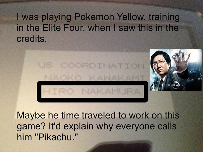 So, I was playing Pokemon Yellow, training in the Elite Four during a long car ride, when I glimpsed this in the credits. Lo and behold, Hiro Nakamura actually worked on Pokemon Yellow. I'm a huge Heroes fan, and I was ecstatic to find this.