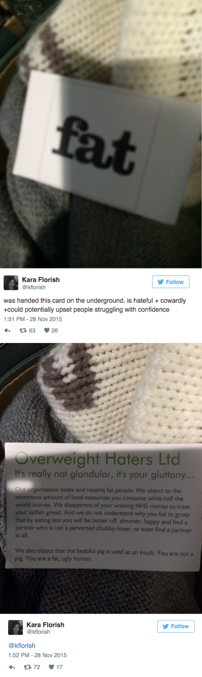 National Health Services (NHS) worker Kara Florish took to Twitter to document receiving a body-image shaming business card on London's Underground.