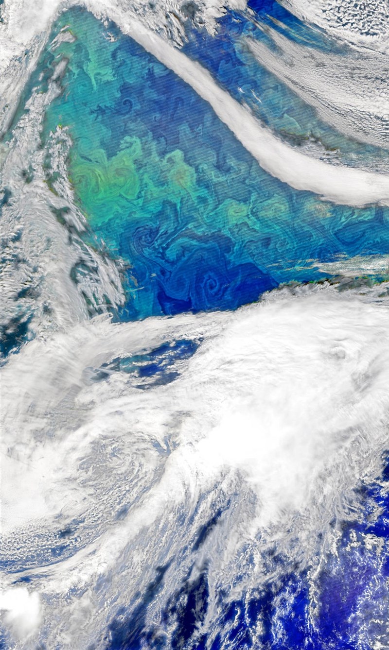 This image was taken by the Suomi NPP satellite. Data from chlorophyll in the phytoplankton was combined with red, green and blue bands from the satellite's imaging system to make this picture. The mission of the satellite is to keep track of climate change and weather.