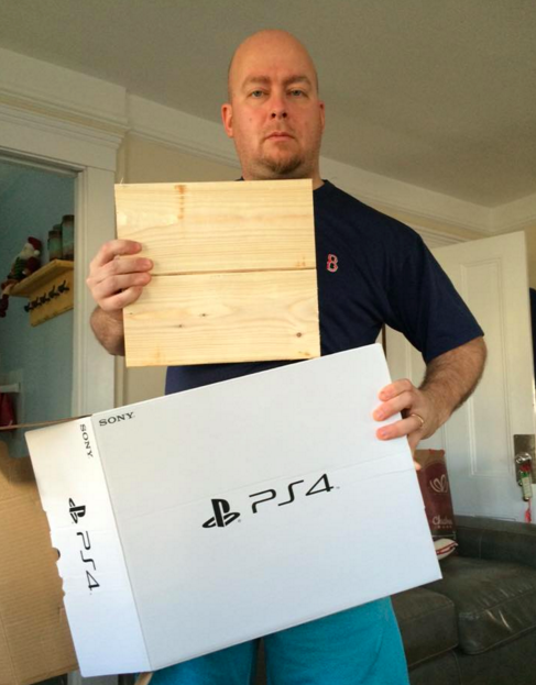 Nine-year-old Scott Lundy was so excited to receive a PS4 this christmas until he opened the box and found a wooden replica of the system placed there by thieves. To add insult to injury, they included a "crude drawing of male genitals" (missed opportunity for a dickbutt) on the wood and a message that said "from cock and balls with love."