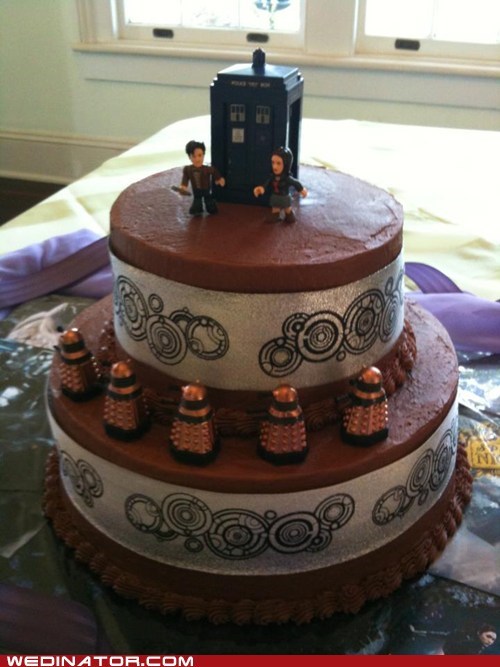 The groom is a huge Whovian and designed every detail of the cake himself. The silver ribbon was custom screenprinted with the name of the Doctor in Galifreyan script by the groom's mother. He even colored the Amy figurine's hair to match the bride's. For her part, the bride surprised him with the Doctor Who themed photo collage platform for his cake, proving that he could never find a better companion anywhere throughout time and space. -