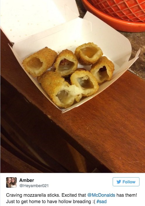 McDonald's has apparently been handing out mozzarella sticks with no mozzarella in them. Several disappointed customers have turned to Twitter to share photos of the sad looking "hollow breading" sticks. These images have gone viral as the rest of the world sympathizes with these unfortunate people's lack of snack. ![]()