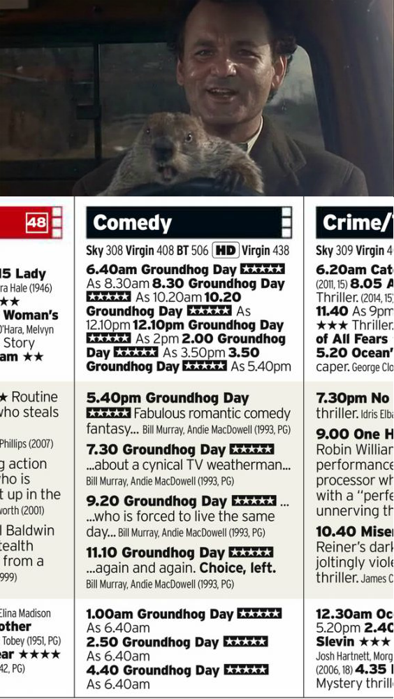 February 2nd is Groundhog Day, the weird holiday where we trust a rodent to tell us when spring is coming, and one UK television channel has found the perfect way to celebrate. If you tune in to Sky any time on the 2nd, you'll find yourself at some point in the 1993 classic film Groundhog Day.