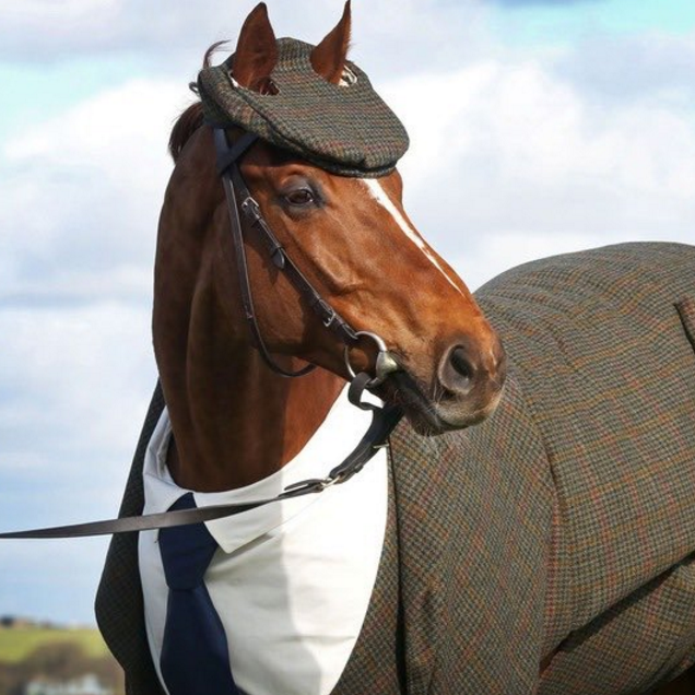 That is a well dressed horse, but why? Apparently, it's almost time for one of the UK's biggest horse racing events, the Cheltenham Festival, and that merits a horse in a tailored tweed suit.