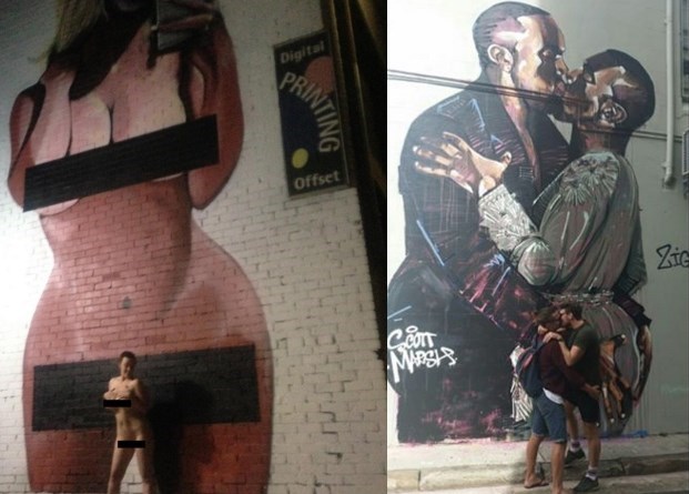 Whent he Kim mural recently got defaced it only prompted more unclothed posing with the caption proclaiming "We can't be shamed!": ![]()