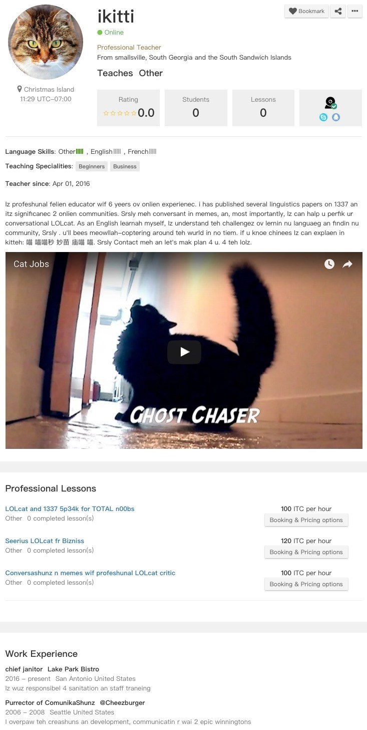 This webpage for italki is either some glorious April Fools' Day joke or just a fake page for a new product. ikitti claims to have worked here at the Cheezburger offices in Seattle from 2006-2008 as our Purrector of ComunikaShunz. Pretty sure we'd remember that, but whatever. The LOLspeak on this page is so impressive, we kinda wish whoever created it really did work here. Good job, internet. Keep being super weird and random.