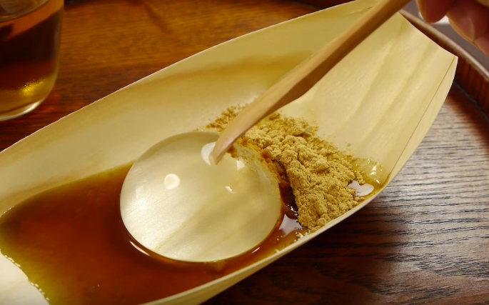 It's actually called Mizu Shingen Mochi but since it's a weird, tasteless gelatin blob it's being marketed to US customers as a "raindrop cake". It's a common desert in Japan, made out of a seaweed based gelatin called Agar. Since it doesn't taste like anything, it's usually accompanied by a sweet syrup and a soybean powder called kinako.