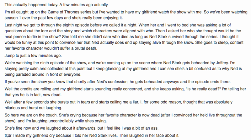Redditor Lies to His Girlfriend About Game of Thrones; Immediately Regrets That Decision