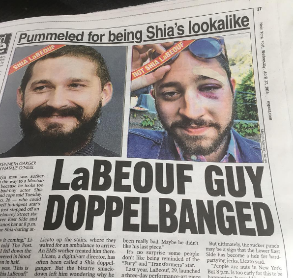 Hey, this is Shia LaBeouf … I just read an article that you were punched in the face because you look like me?" And he was like, "Aw, man. That sucks. I'm so sorry. But I get it. It's happened to me before." And then he was like, "I don't know. I wish I was in New York. I'd come bring you soup." He was just like, "This sucks. I don't even know what to say. I'm sorry. People are just crazy. Just because you look like me?" I was obviously laughing the whole time. And then he was like, "Here's my phone number. Don't give it to anybody. Please, please, call me back. Call me back if you want to. We could chat. Let's giggle over this. Maybe there's a silver lining in all this. But call me back." And then he was like, "And once again, this is Shia LaBeouf, the guy you got hit for looking like. And yeah, man, I'm sorry. I'm just really sorry." And he was like "Keep your head up, G." And that was it.
