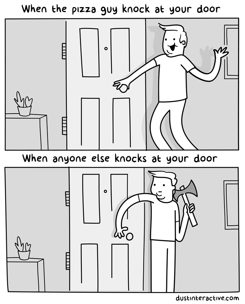 A Rather Accurate Portrayal of How Some of Us Handle the Two Different Kinds of Knocks at Our Doors