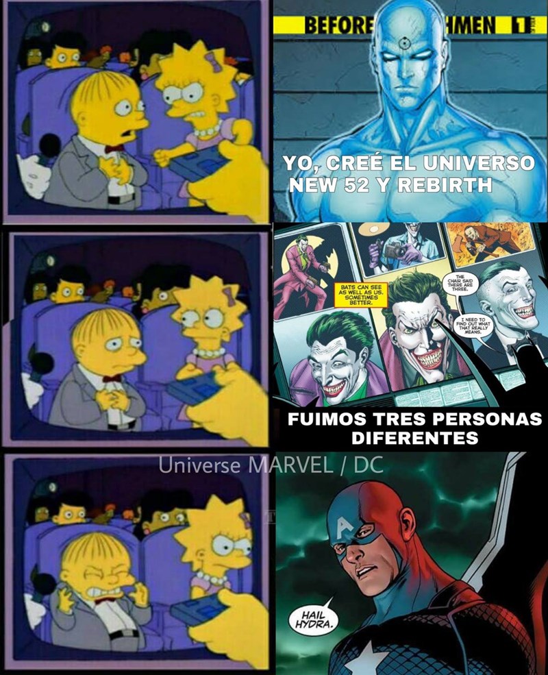 Mientras DC explicaba que el Dr Manhattan, miembro de primera orden de la serie limitada "Watchmen", era el creador del Universo 52 y Rebirth y que el Joker es en realidad 3 personas, Marvel hacía de las suyas aliando al Capitán América con la organización terrorista Hydra.