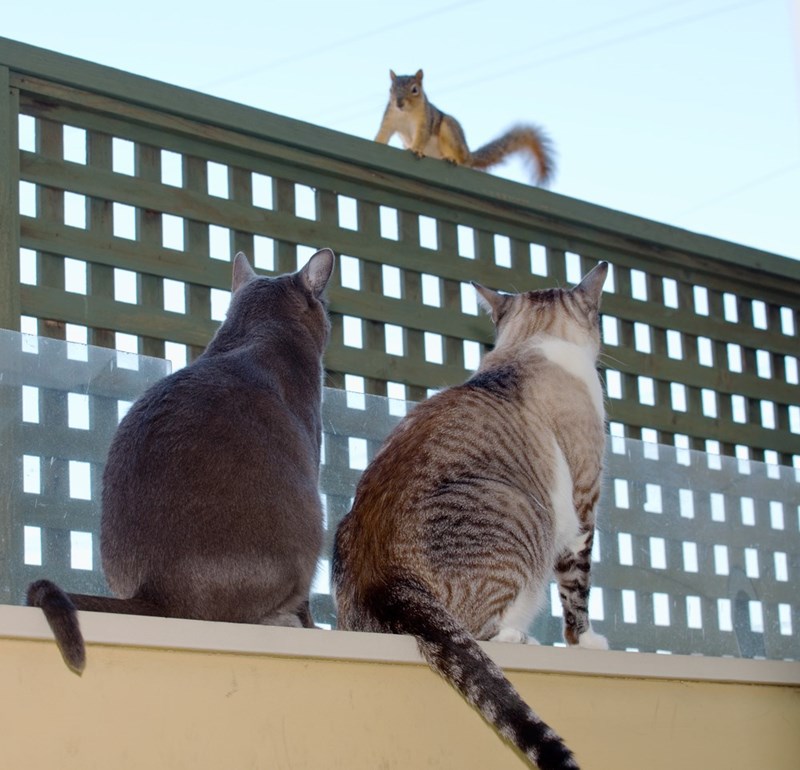 This squirrel spent 20 minutes running back and forth on top of the trellis, flicking his tail, and driving them NUTS.