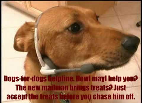Dogs-for-dogs helpline. Howl mayI help you? The new mailman brings treats? Just accept the treats before you chase him off.