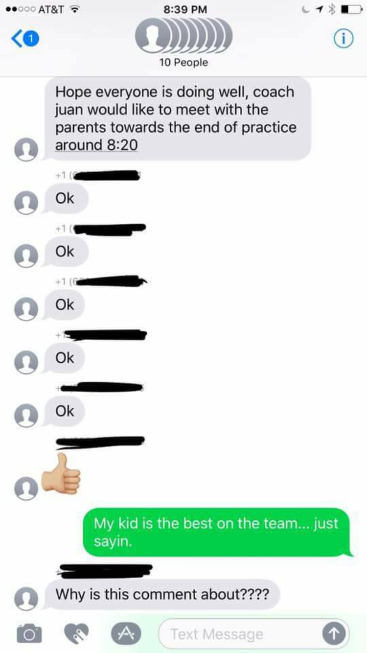 If you find yourself mistakenly added to a group text between soccer moms, your best course of action is to trigger them to no end by saying that your "imaginary" kid is the best. There's no coming back from tossing that kind of shade. And a beautiful touch with the halftime snacks comment.