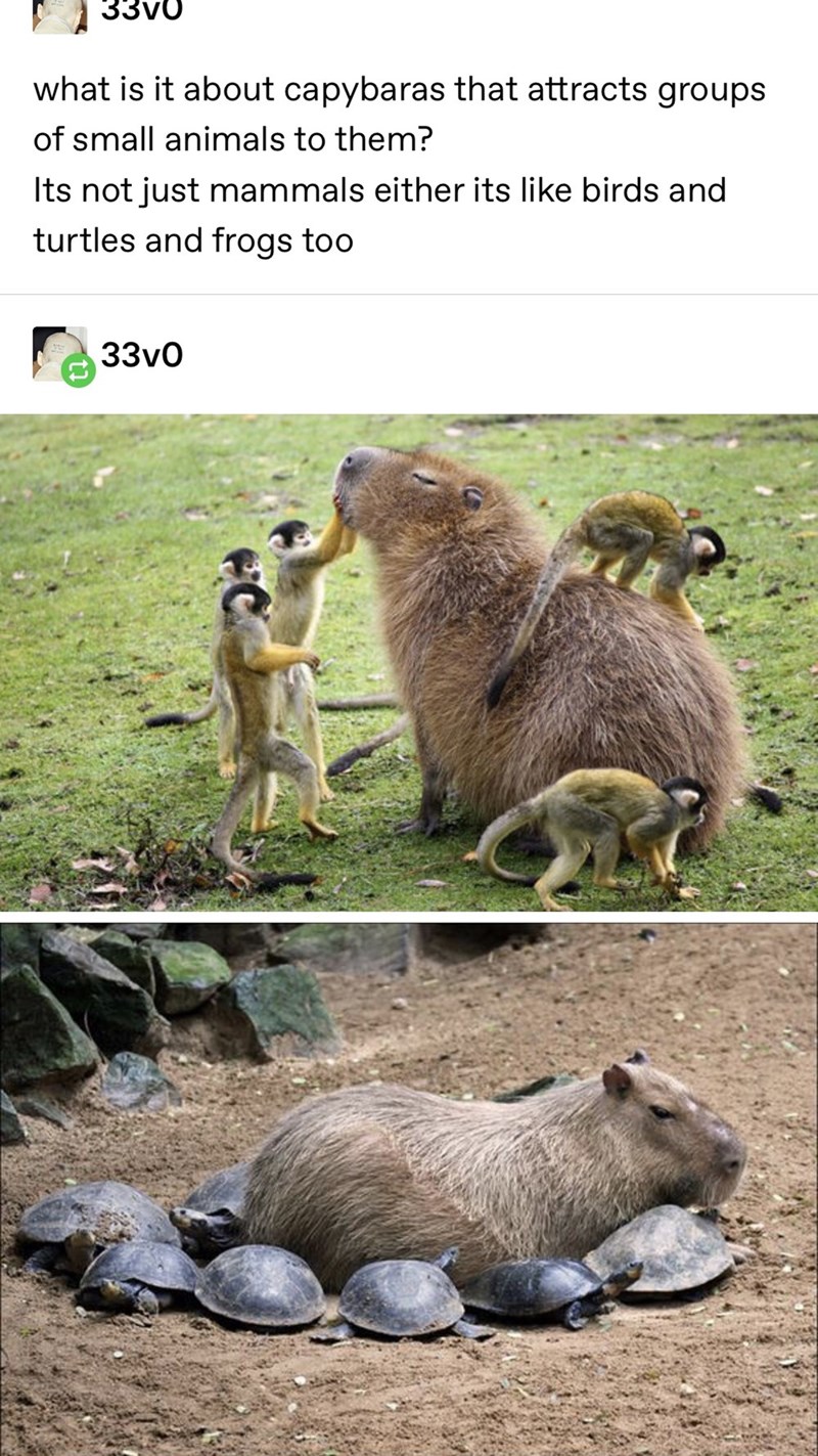 This tumblr thread shows, with cute photo evidence, that other animals just seem to get along with capybaras. Not only are they shaped like friends, animal sanctuaries have also used them as sort of foster moms. If only everyone could be as chill as the worlds largest rodent. For another wholesome thing, here's a list of all the animals one tumblr's grandpa brought home.