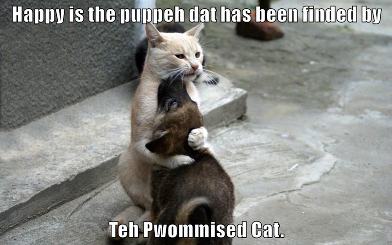 Happy is the puppeh dat has been finded by Teh Pwommised Cat.