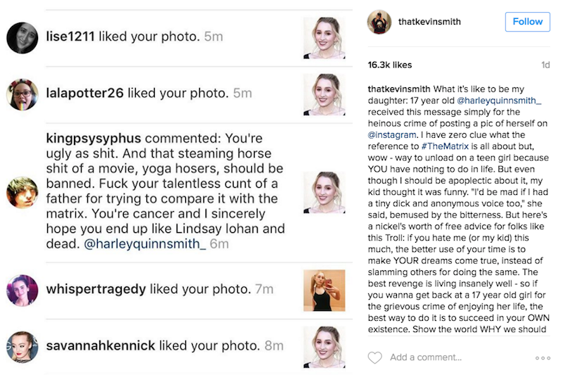Harley Quinn Smith, star of Yoga Hosers and daughter of notable nerd Kevin Smith, got targeted by an online bully on Instagram with a Matrix-fetish: