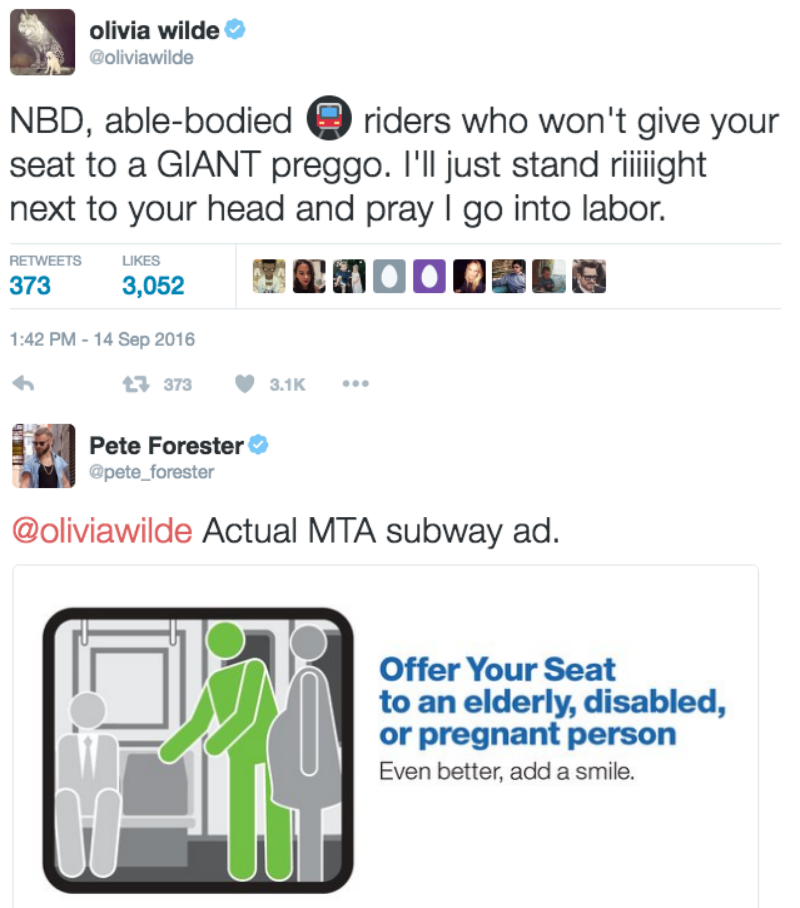 But since this passive-aggressive tweet was open for the Internet to chime in, people piled on Wilde for riding the subway (over taking an uber) and for choosing to be pregnant (over not, and not needing to confront the rude riders).