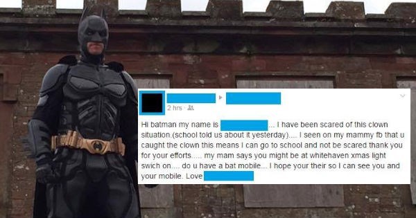 "It appears a superhero has swooped in, determined to help youngsters sleep easy tonight. Cumbria Superheroes, a costume company, has sent ‘Batman’ out and about on the town’s streets to fight off the evil clowns. The man behind it insists he is not a vigilante, but is hoping to give children some reassurance that they are safe."