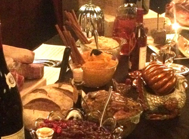 "Green beans not exactly like the ones the first Pilgrims and Native Americans shared - these are prepared with chunks of imported $90/lb ham from pigs fed a special root diet."