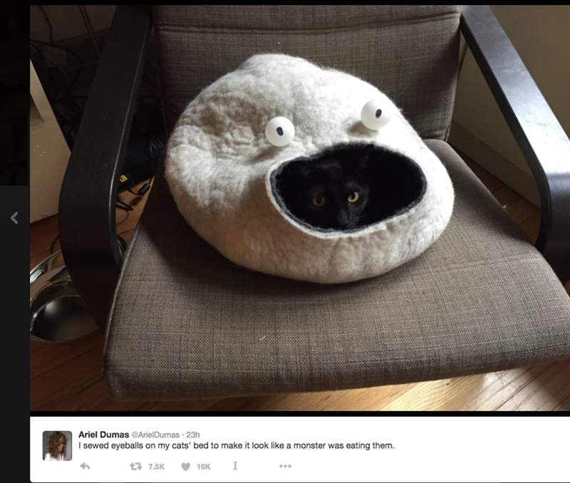 Ariel Dumas, a writer for The Late Show with Stephen Colbert, took her cat bed to the next level with four tools: a sewing kit, a marker, and two pingpong balls. The result: A monstrous cat bed that’s the perfect domicile for her feline friends.