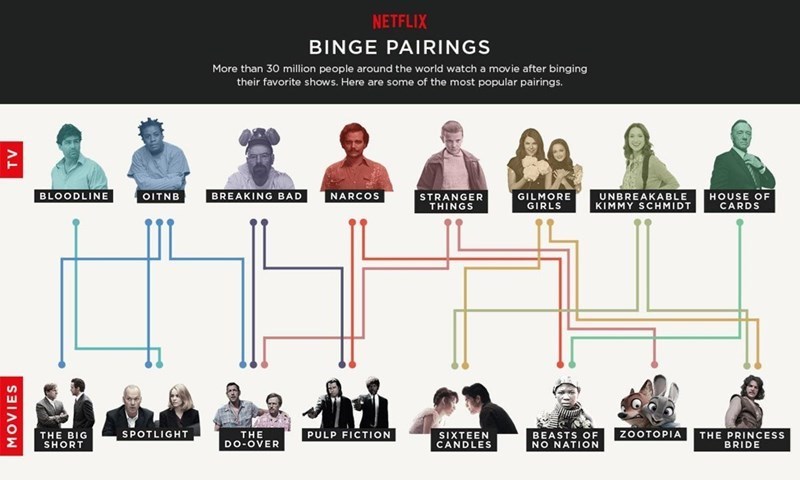 The study went even farther, looking at what movies people commonly watch after a good binge. They found that people like to stay in the same genre when going from binge watch to movie watch. According to TIME, “After finishing all four seasons of House of Cards, viewers often watched Beasts of No Nation. Bingers of Gilmore Girls went on to watch Sixteen Candles and The Princess Bride. Bloodline was frequently followed up with a serving of Spotlight for dessert”