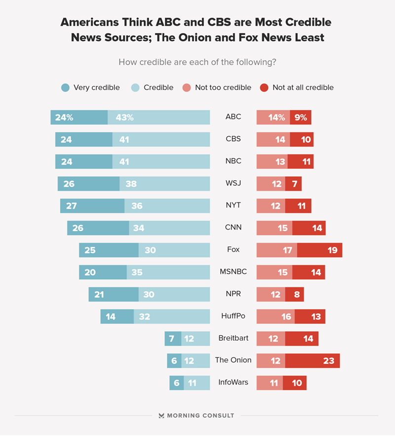 According to Morning Consult, “a media and technology company at the intersection of politics, policy, Wall Street, and business strategy,” the satirical newspaper The Onion, which recently ran the headline “Report: Bananas Still Most Popular Fruit For Pretending To Receive Phone Call” is more credible than Infowars, which recently ran the headline “The Shocking Proof That Multiculturalism Has Failed.” No surprise here: The Onion headline is true.
