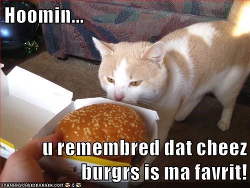 Hoomin... u remembred dat cheez burgrs is ma favrit!