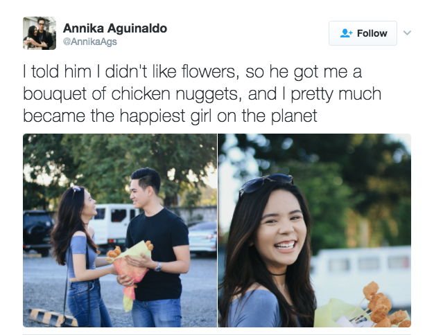 I told him I didn't like flowers, so he got me a bouquet of chicken nuggets, and I pretty much became the happiest girl on the planet pic.twitter.com/H6zLpud8wW