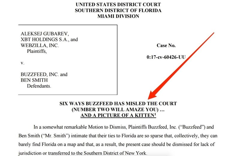 The Russian executive decided to file a libel lawsuit against the media company, which responded with an apology and the redaction of Gubarev's name from the dossier. While Buzzfeed is still struggling with the lawsuit, at least we have this entertaining mockery of the website's tendency to publish listicles and cat photos. Sometimes even lawyers can be funny.