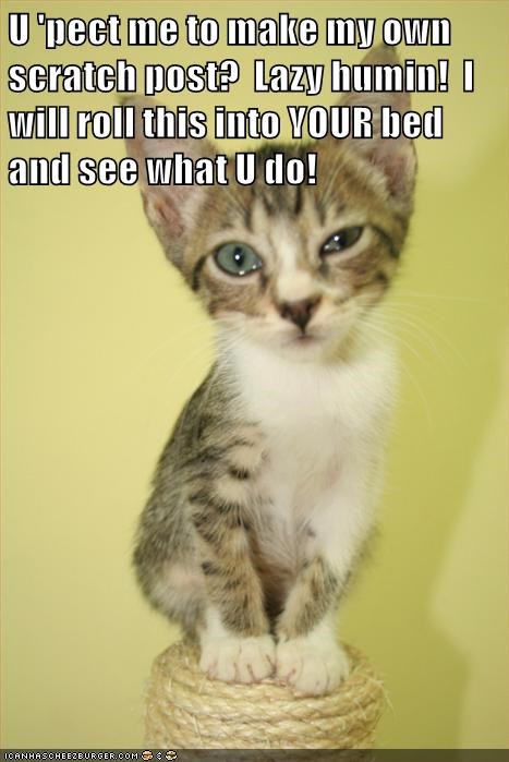U 'pect me to make my own scratch post? Lazy humin! I will roll this into YOUR bed and see what U do!
