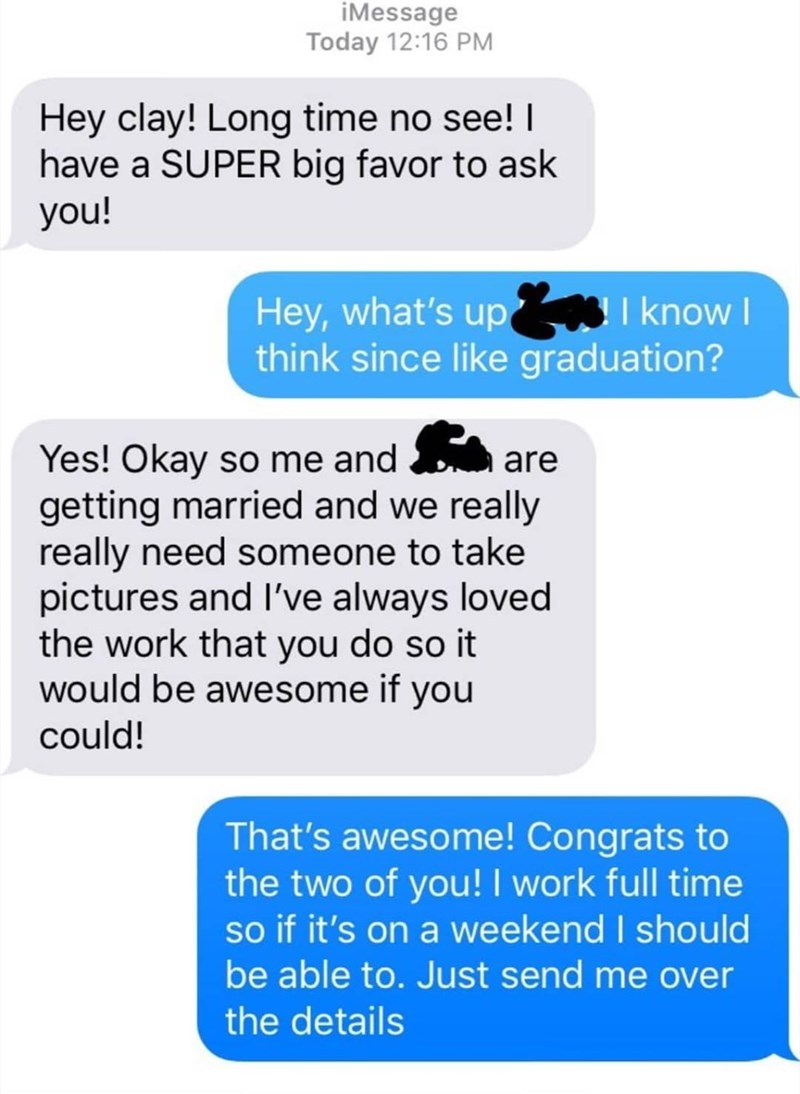 Taking photos may not be the most fun gig in the world, but usually you expect it to pay. From navigating drunk aunts, to making sure your clients have beautiful ways to remember their special day, this kind of labor deserves to be rewarded in kind. This choosy beggar seems to disagree - and actually balks at the very fair rate his friend usually charges. Pretty sick stuff. If this isn't enough proof that people are terrible, check out this gallery that is chock full of entitled wastes of space.