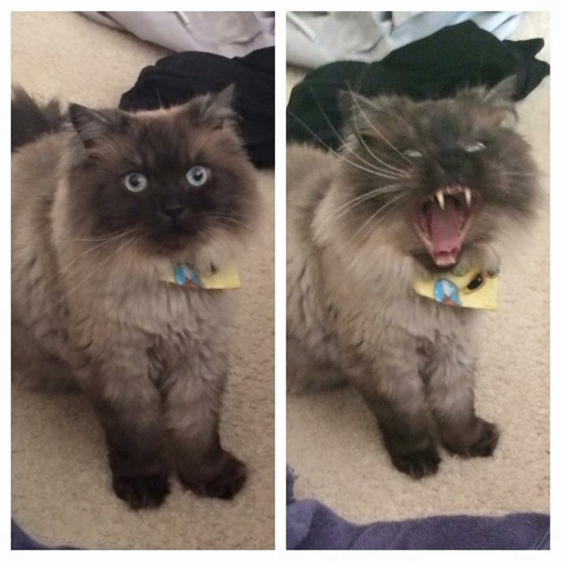 A cat before and during his yawn. He looks possessed!