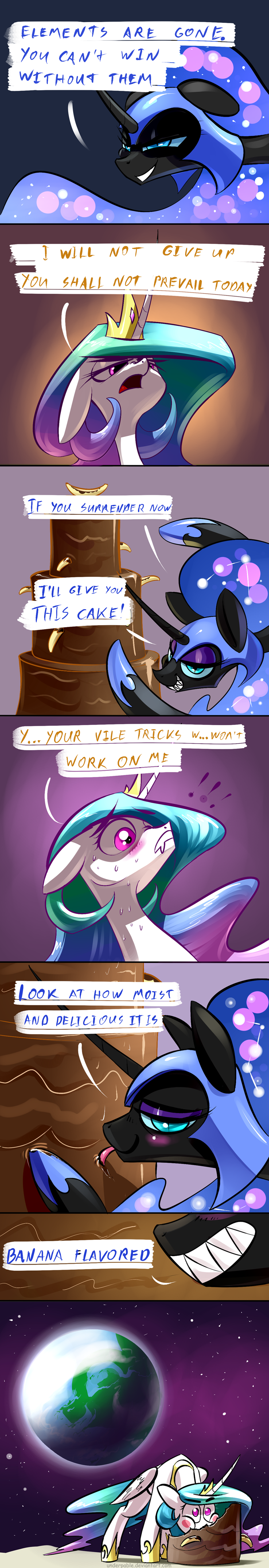 Celestia: "Sticking bananas into chocolate cake doesn't make it banana flavored."Nightmare Moon: "Yes it does"