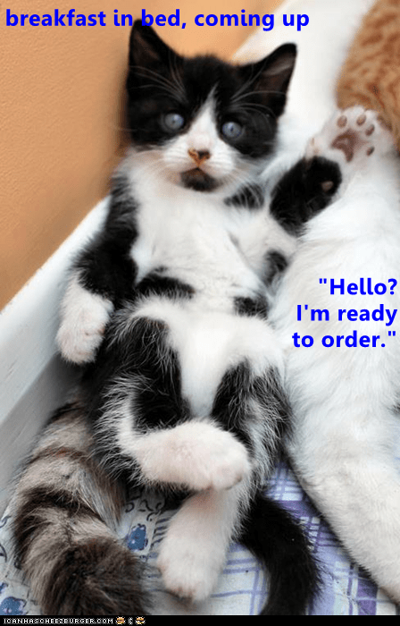 Breakfast in bed, coming up "Hello? I'm ready to order."