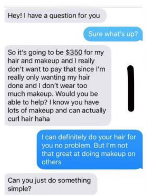 This bride wanted her friend to help her out with a free makeover, and when the friend agrees to do it for free, she actually turns it down because it's not as complicated and extravagant as she'd hoped for. I mean, come on. Beggars can't be choosers.