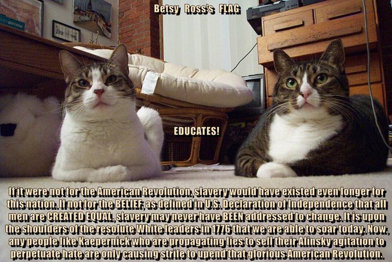 Betsy Ross's FLAG EDUCATES! If it were not for the American Revolution, slavery would have existed even longer for this nation. If not for the BELIEF, as defined in U.S. Declaration of Independence that all men are CREATED EQUAL, slavery may never have BEEN addressed to change. It is upon the shoulders of the resolute White leaders in 1776 that we are able to soar today. Now, any people like Kaepernick who are propagating lies to sell their Alinsky agitation to perpetuate hate are only causi