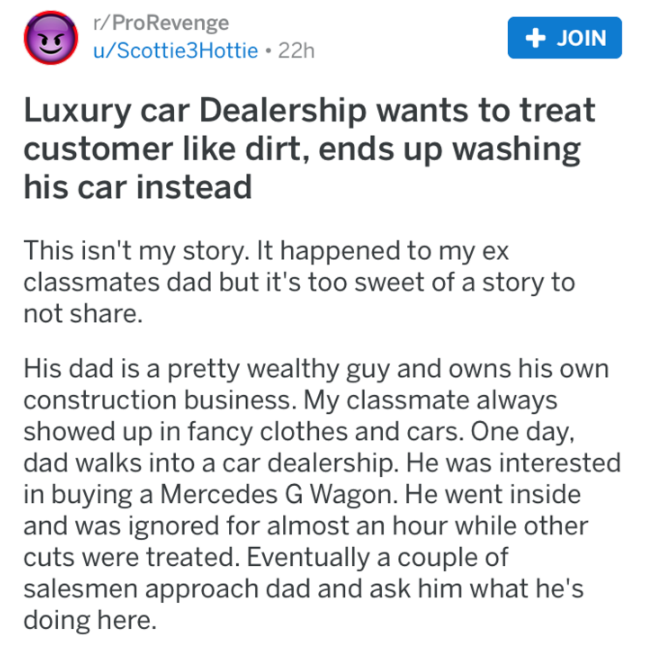 When this dad showed up at a luxury car dealership not looking the part of a wealthy customer, the employees proceeded to not take him seriously. They were rude and judgmental, and ultimately paid the price. Dad gets the sweet satisfaction of enjoying free car washes from the very people who wrote him off in the first place.