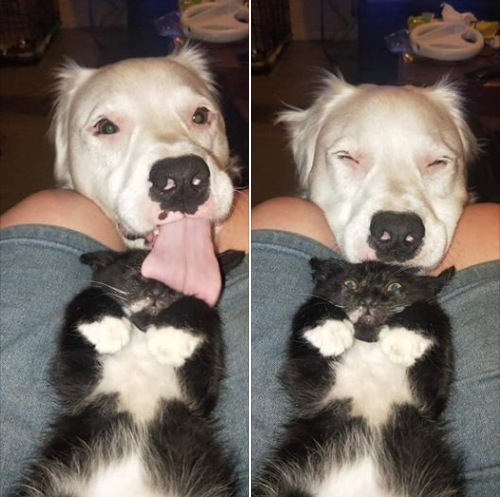How a tiny orange kitten goes from fearing to loving and cuddling with a giant Alaskan Malamute puppy