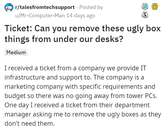 People have a pretty abysmal knowledge of computers, but almost never so bad that they try to have them removed from their office. IT people have to be very patient when a customer's computer won't work. Sometimes people don't know what a power button is. We don't envy people who have to deal with this level of ignorance on a daily basis.