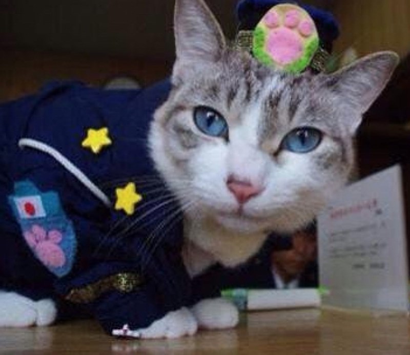 Lemon, a former stray, now works for the Kyoto Police Department in Japan. When he's on duty, Lemon wears a police uniform and helps boost morale at the office. His primary responsibility is to visit the elderly with his owner and give cuddles while they're trained on the hazards of fraudulent phone calls. Lemon is great at keeping these folks calm and relaxed.