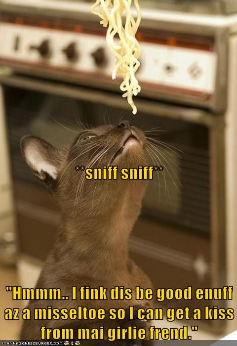 **sniff sniff** "Hmmm.. I fink dis be good enuff az a misseltoe so I can get a kiss from mai girlie frend."