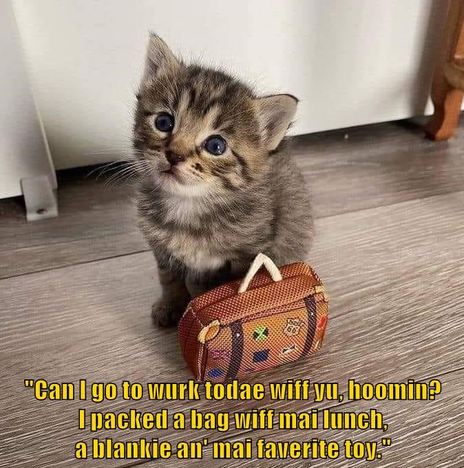 "Can I go to wurk todae wiff yu, hoomin? I packed a bag wiff mai lunch, a blankie an' mai faverite toy."