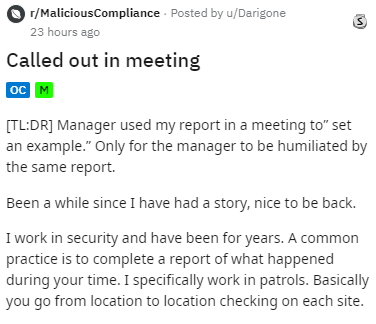 After demanding everyone do painstaking logs, not reading them himself, and chastising his staff during a meeting, this manager was made to look like the jackass he really was. Frustrated employees sometimes give incompetent managers a taste of their own medicine, like this guy who was instructed to guard a spill, so he did it for hours.