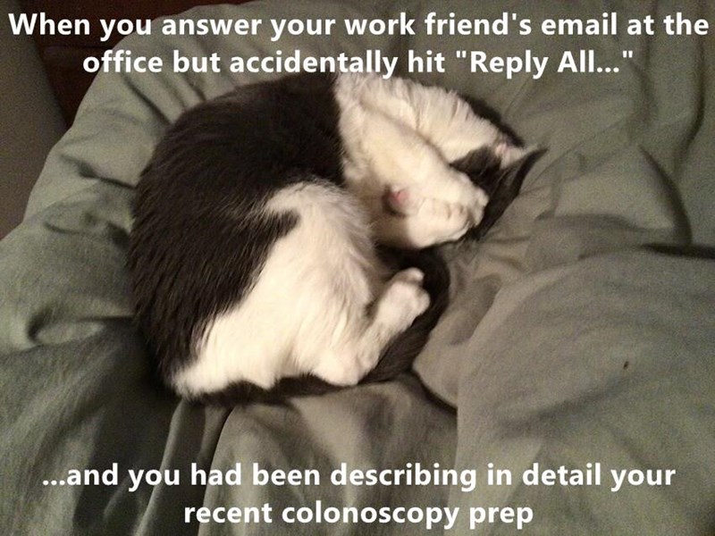When you answer your work friend's email at the office but accidentally hit "Reply All..." ...and you had been describing in detail your recent colonoscopy prep