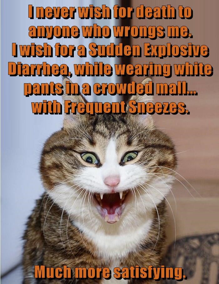 I never wish for death to anyone who wrongs me. I wish for a Sudden Explosive Diarrhea, while wearing white pants in a crowded mall... with Frequent Sneezes. Much more satisfying.