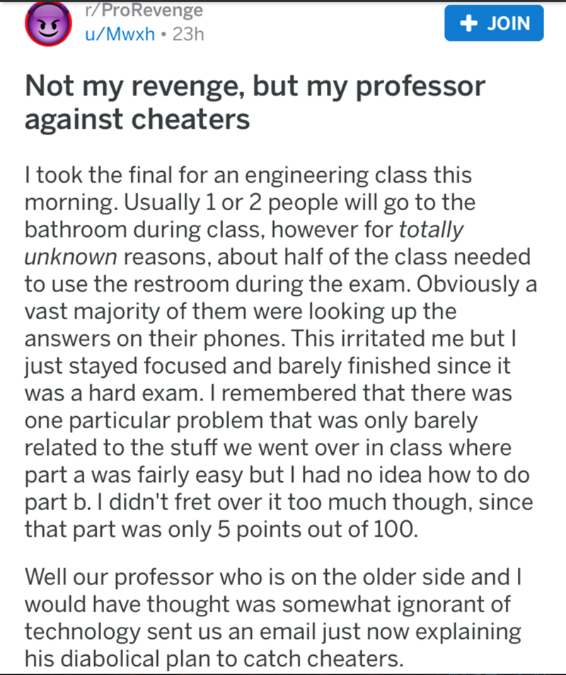 This old and wise professor taught his rascal students a humbling lesson in why you shouldn't cheat in the classroom. They naively assumed that he wouldn't be able to figure out what they were up to, and they couldn't have been more wrong. A solid win for Prof!