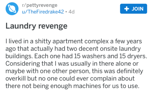 For anyone that's ever dealt with navigating the tender nature of a shared laundry room, and tried to ensure that your clothes don't get messed with, this one's going to hit close to home. Laundry is time-sapping and irritating enough without someone messing up your process. This person got caught red-handed, and ultimately was dealt the kind of petty revenge that had to have taught them a lesson.